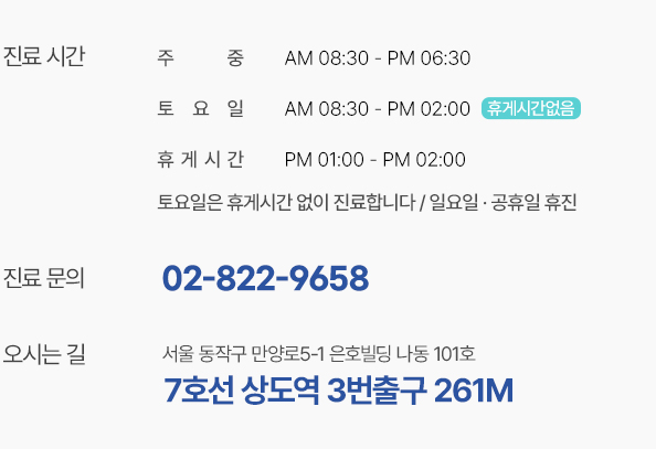 대표번호 : 02-822-9658 ㅣ 서울 동작구 만양로 5-1 은호빌딩 1층 101호